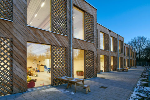 It is perhaps particularly noteworthy that despite the strictness of the modules, the floor plan departs from the orthogonal grid. By slightly rotating and offsetting the modules, the group rooms become legible in shape and open up to the outside space with playful elegance.