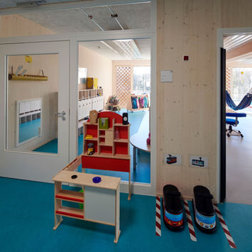 Le bâtiment est conçu et réalisé selon une construction modulaire en bois. Sur une dalle de béton, seul le bois a été utilisé comme matériau structurel et esthétique. Ceci caractérise l'atmosphère du bâtiment, tant à l'intérieur qu'à l'extérieur.