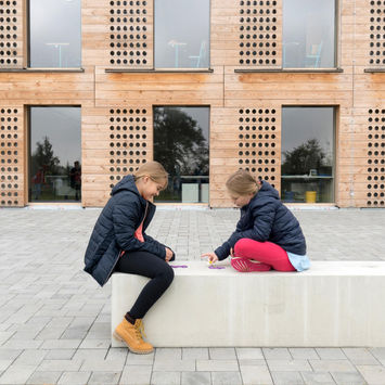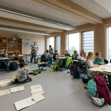 Toutes les salles de classe et les salles spécialisées s'ouvrent sur l'extérieur grâce à de larges baies vitrées. Ceci maximise l'apport de lumière naturelle et offre aux enfants une connexion privilégiée avec l'espace extérieur. Les fenêtres assurent également une ventilation naturelle. Le revêtement de façade se prolonge devant ces éléments de ventilation, des ouvertures soulignant discrètement leur fonction. Les murs extérieurs sont revêtus de planches de sapin de Douglas brut, conférant au nouveau bâtiment scolaire une structure indépendante qui relie le corridor vert voisin au nouveau quartier résidentiel. Les encadrements de portes et de fenêtres sont en profilés de bois. Toutes les salles de classe et les salles spécialisées sont équipées de protections solaires extérieures ; les couloirs sont également dotés de stores. Les modules du bâtiment sont des constructions autoportantes d'une portée allant jusqu'à sept mètres ; une salle de classe est composée de trois éléments.
